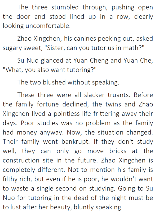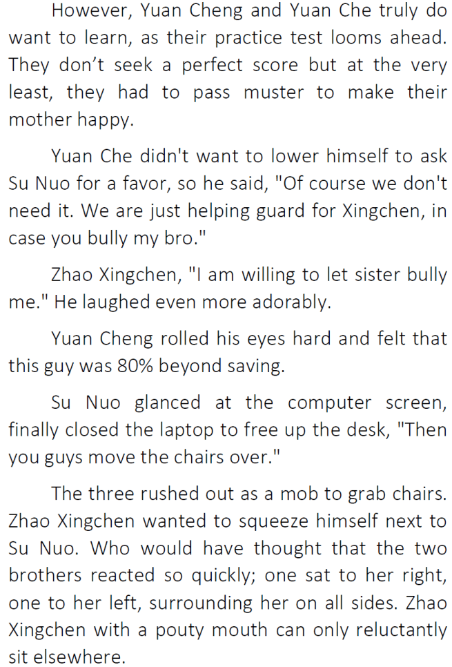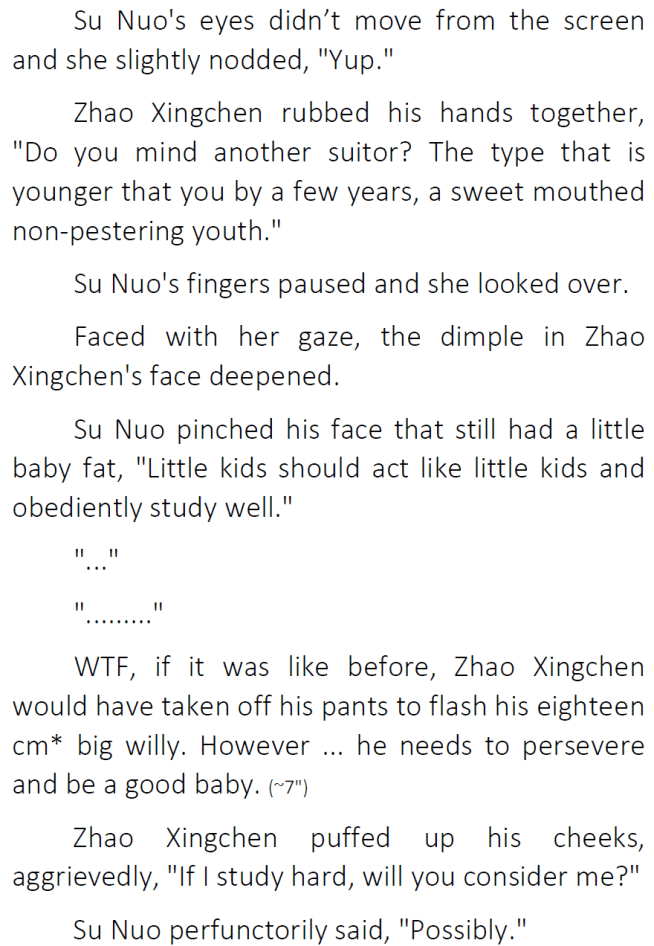 Zhao Xingchen’s crush on Su Nuo so far seems pretty cute, hasn’t crossed the boundaries of being inappropriate though I assume it can. The author has let her characters act within reasonable limits of how people really are. Yanderes/stalkers are really not that realistic though it does happen in real life.