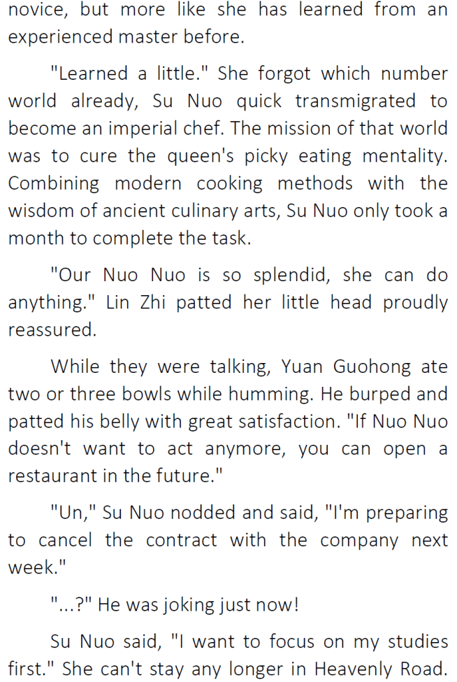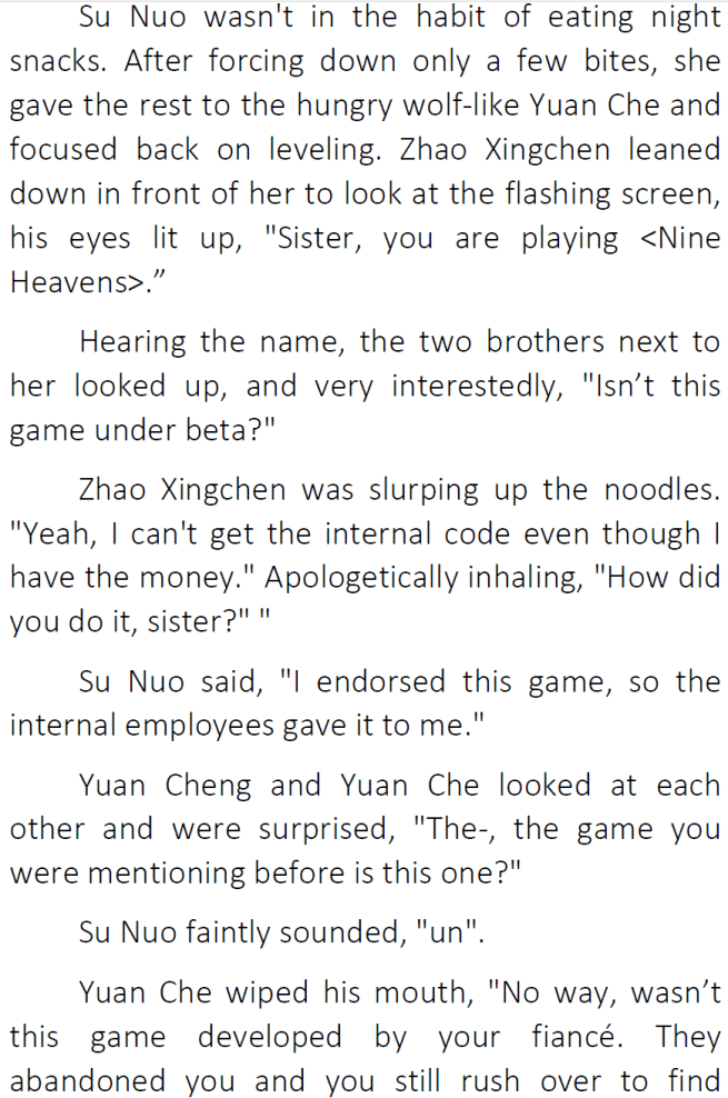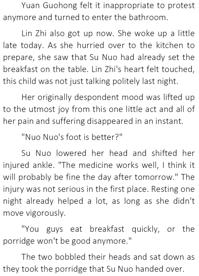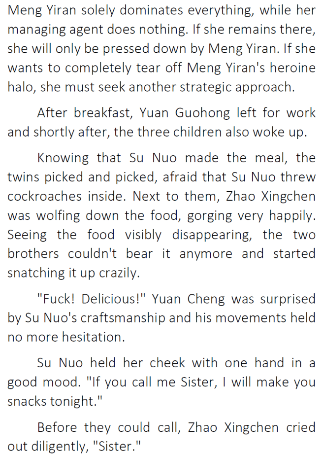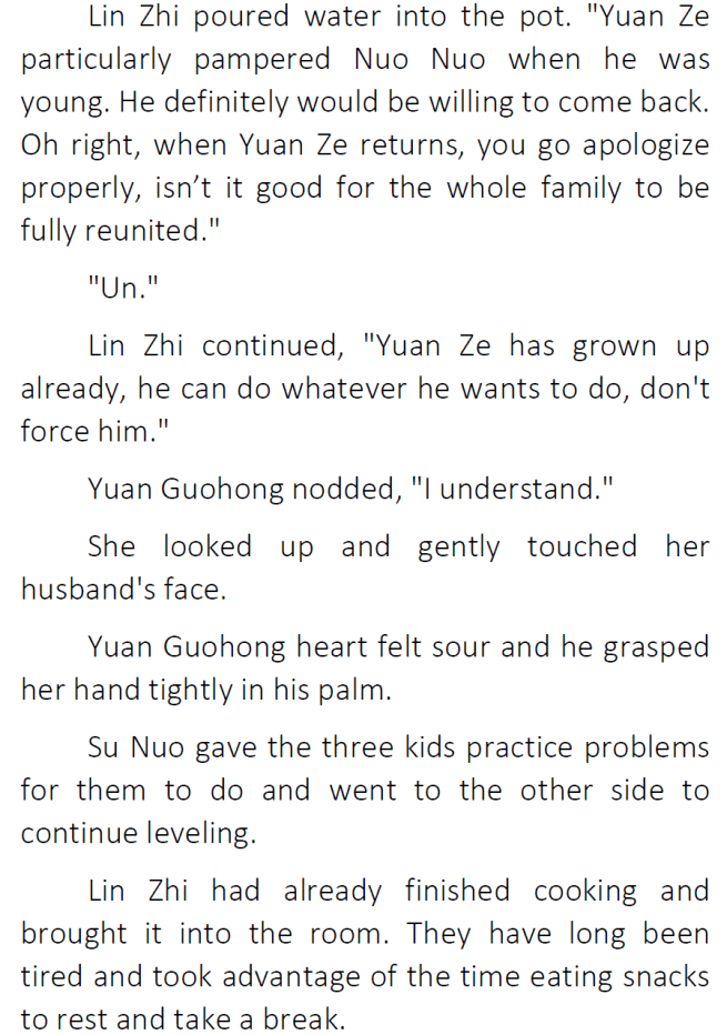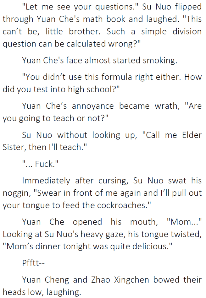 Thanks for the chapter! I’ve honestly been enjoying seeing Su Nuo get along with her original family 😀